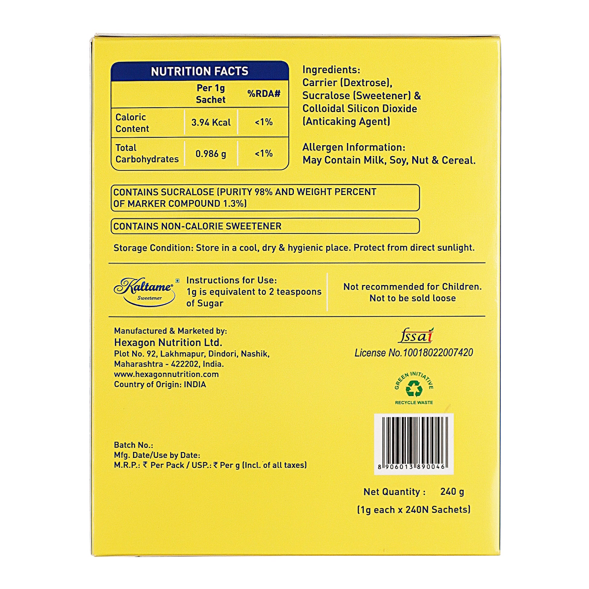 - Kaltame Sugar-Free Sweetener (240 sachets): A low-calorie artificial sweetener that makes diabetic meals and beverages enjoyable without raising blood sugar.